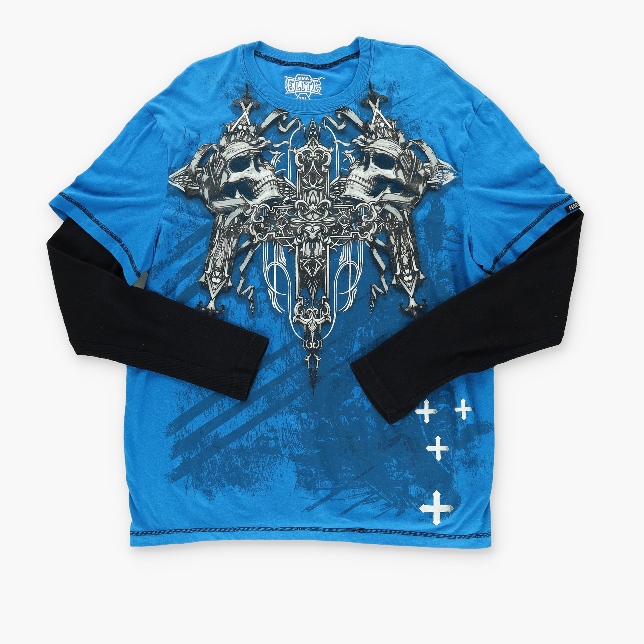 MMA ELITE Y2K Grunge Skull Cross Blue & Black Long Sleeve Tee (XXL)