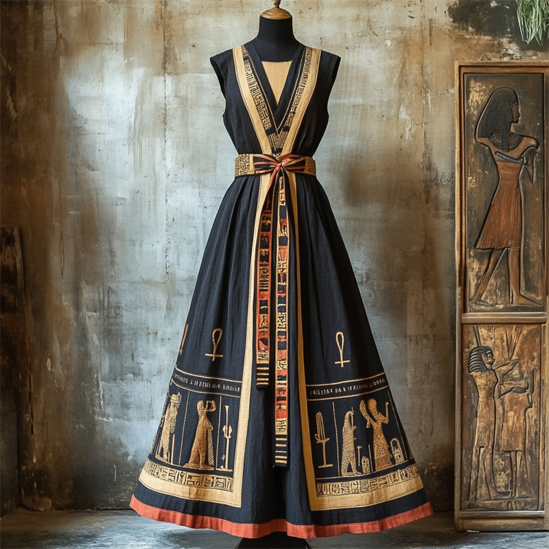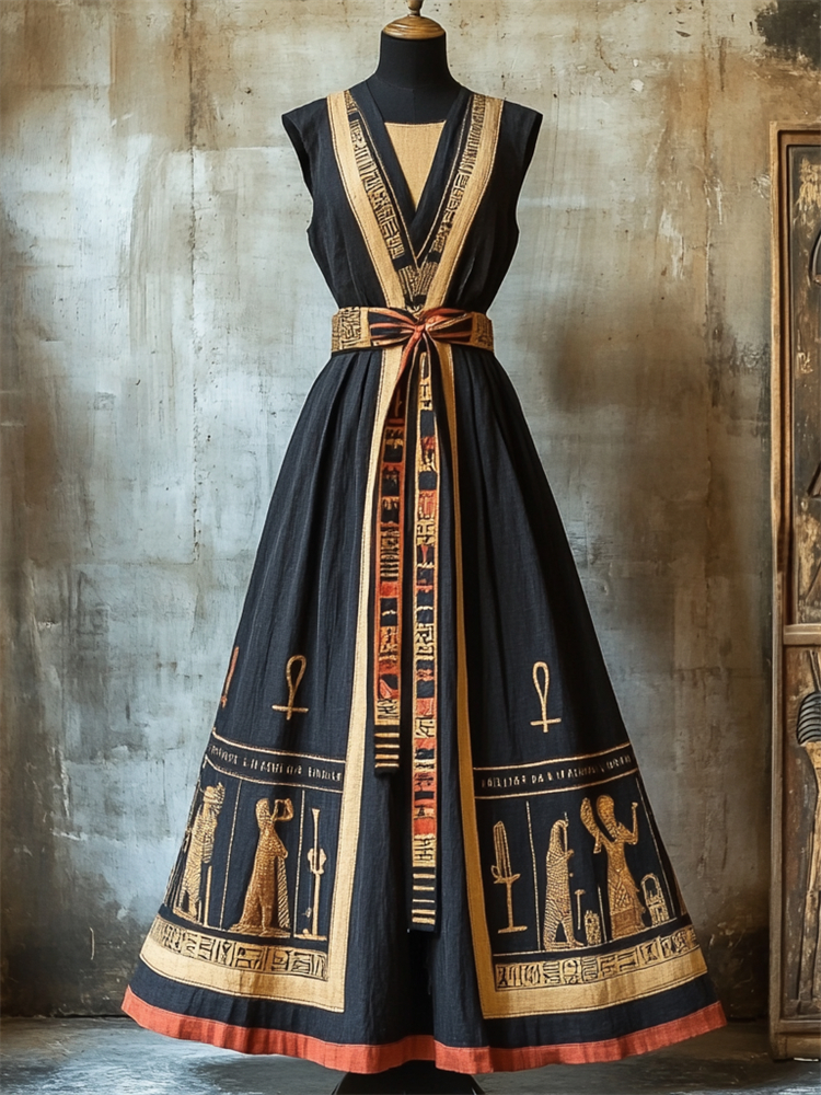 Vintage Ancient Egyptian Inspired Tied Linen Maxi Dress