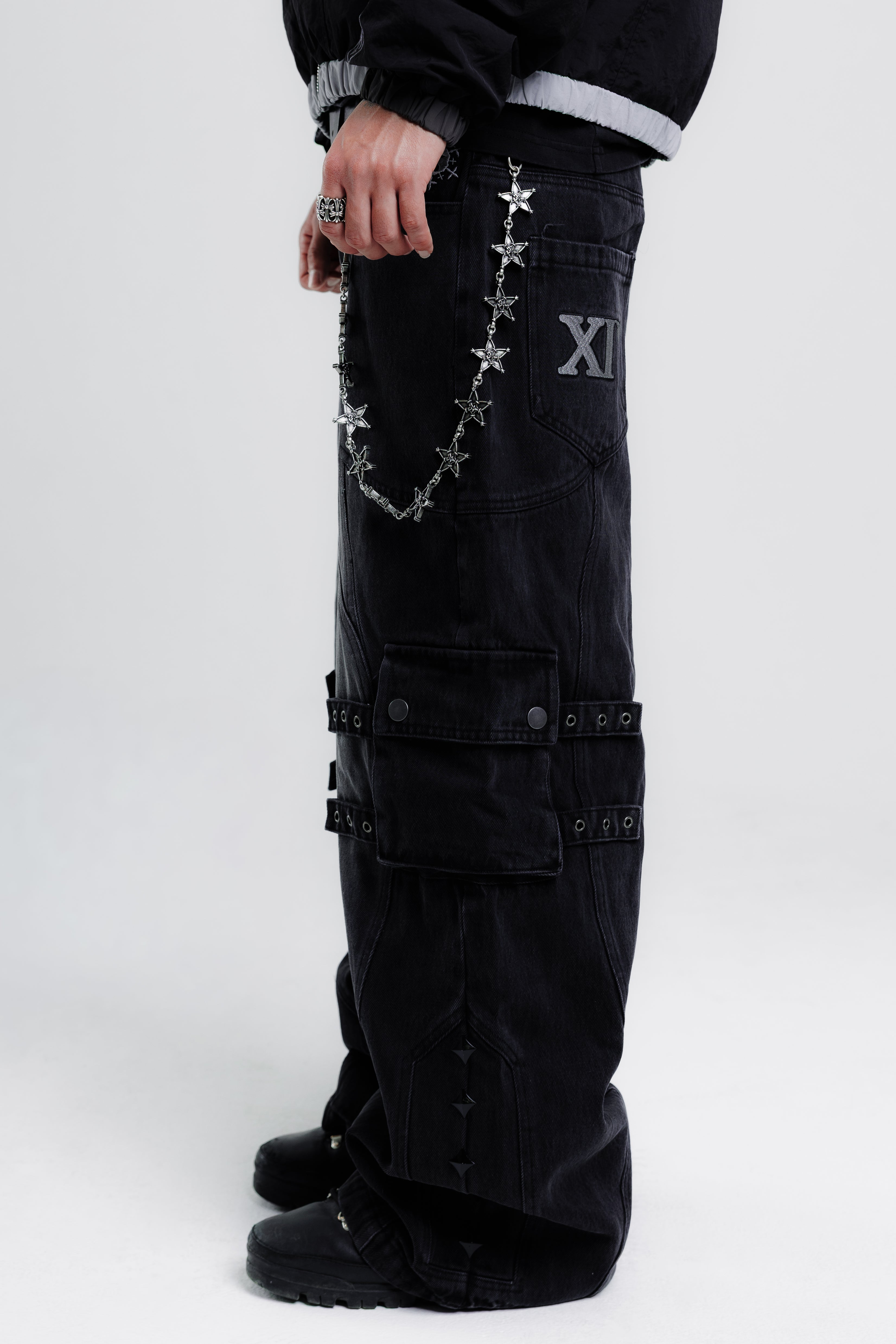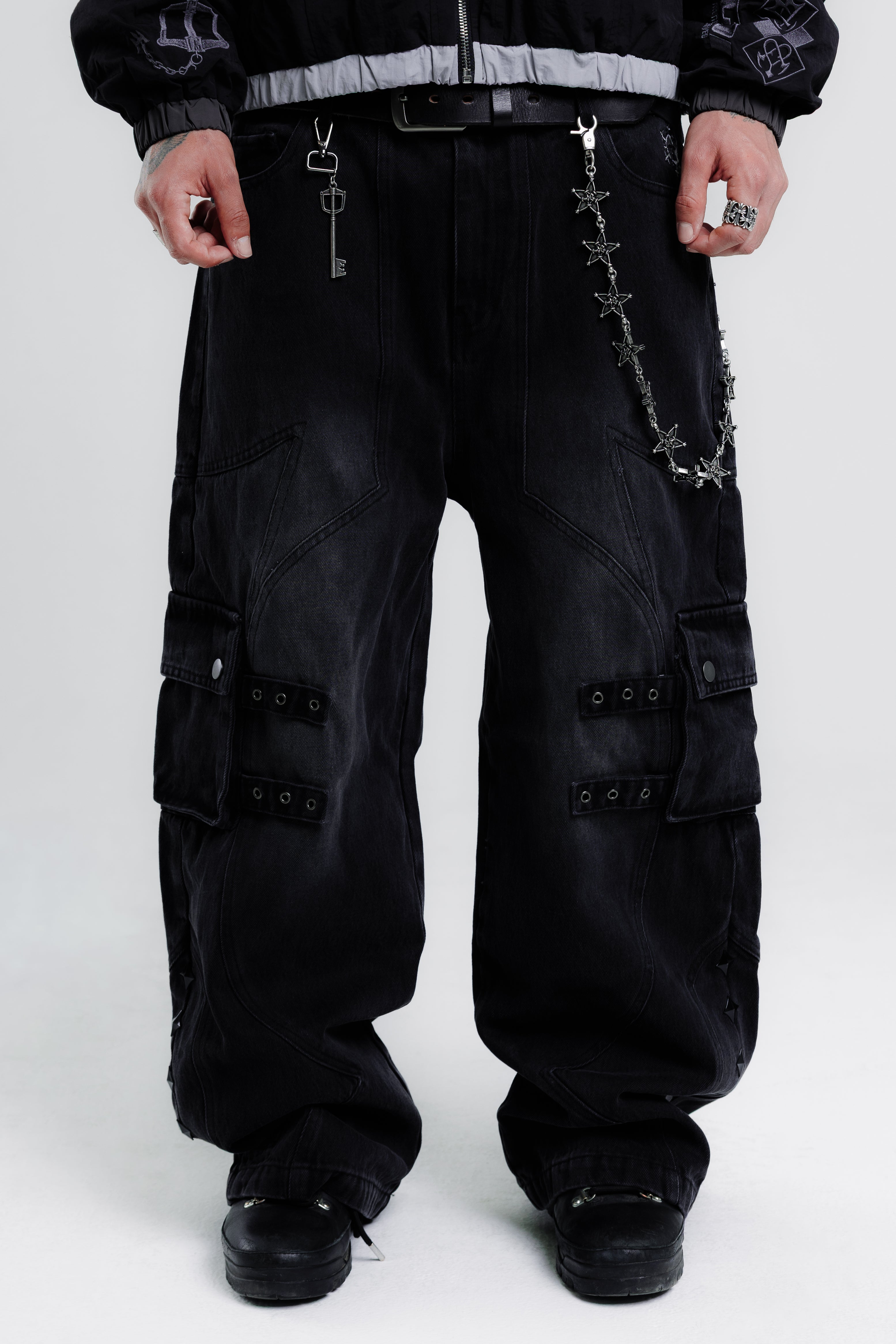 -custom front & back splicing pattern with cargo pockets & straps