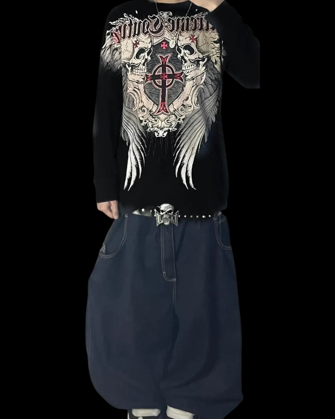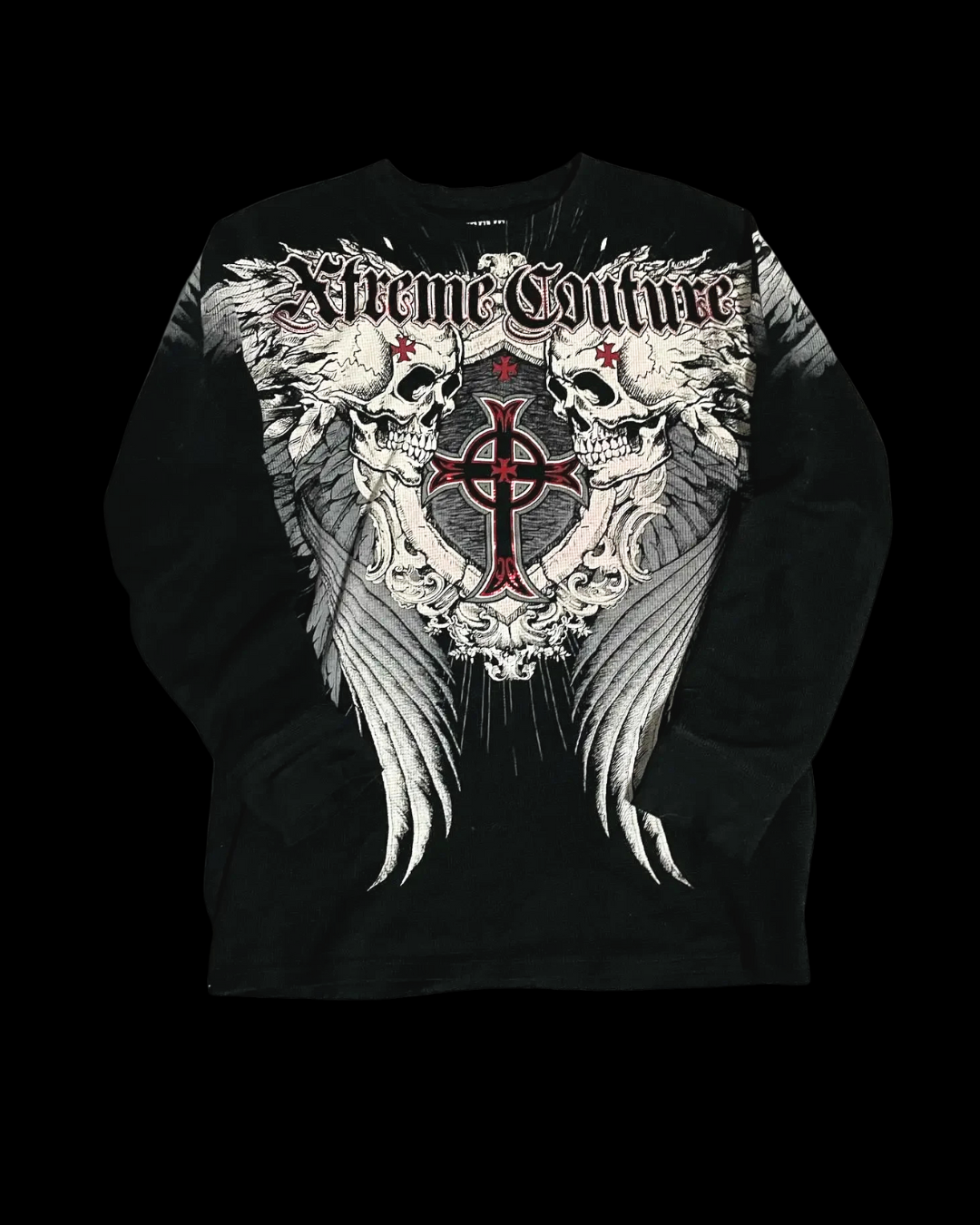 Black long-sleeve tee with oversized Xtreme Couture inspired front and back prints: winged cross crest framed by mirrored skulls, silver feathering, and red accents. Ribbed cuffs, soft lightweight blend, and a regular fit that works with any bottoms. True to size, and ready to ship.