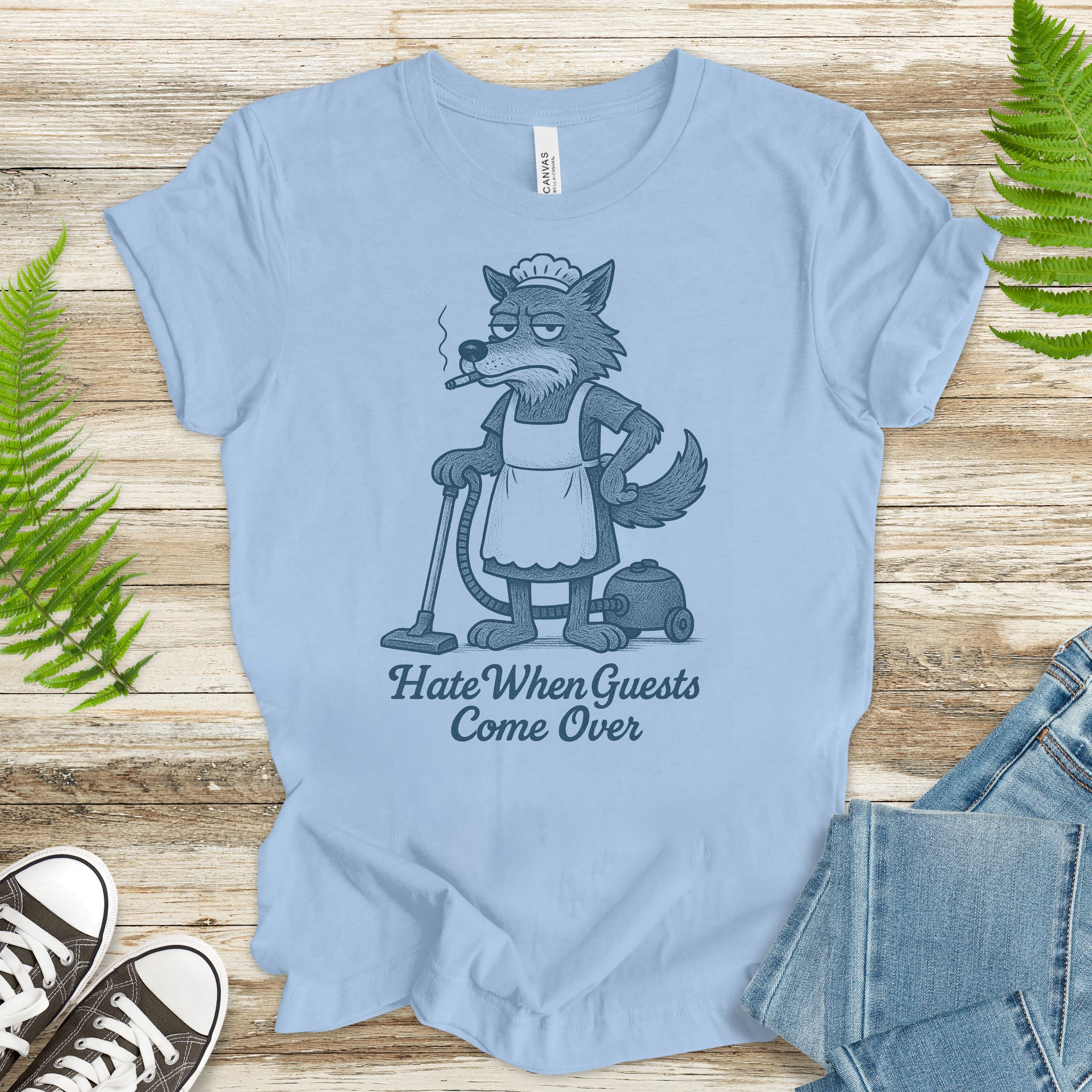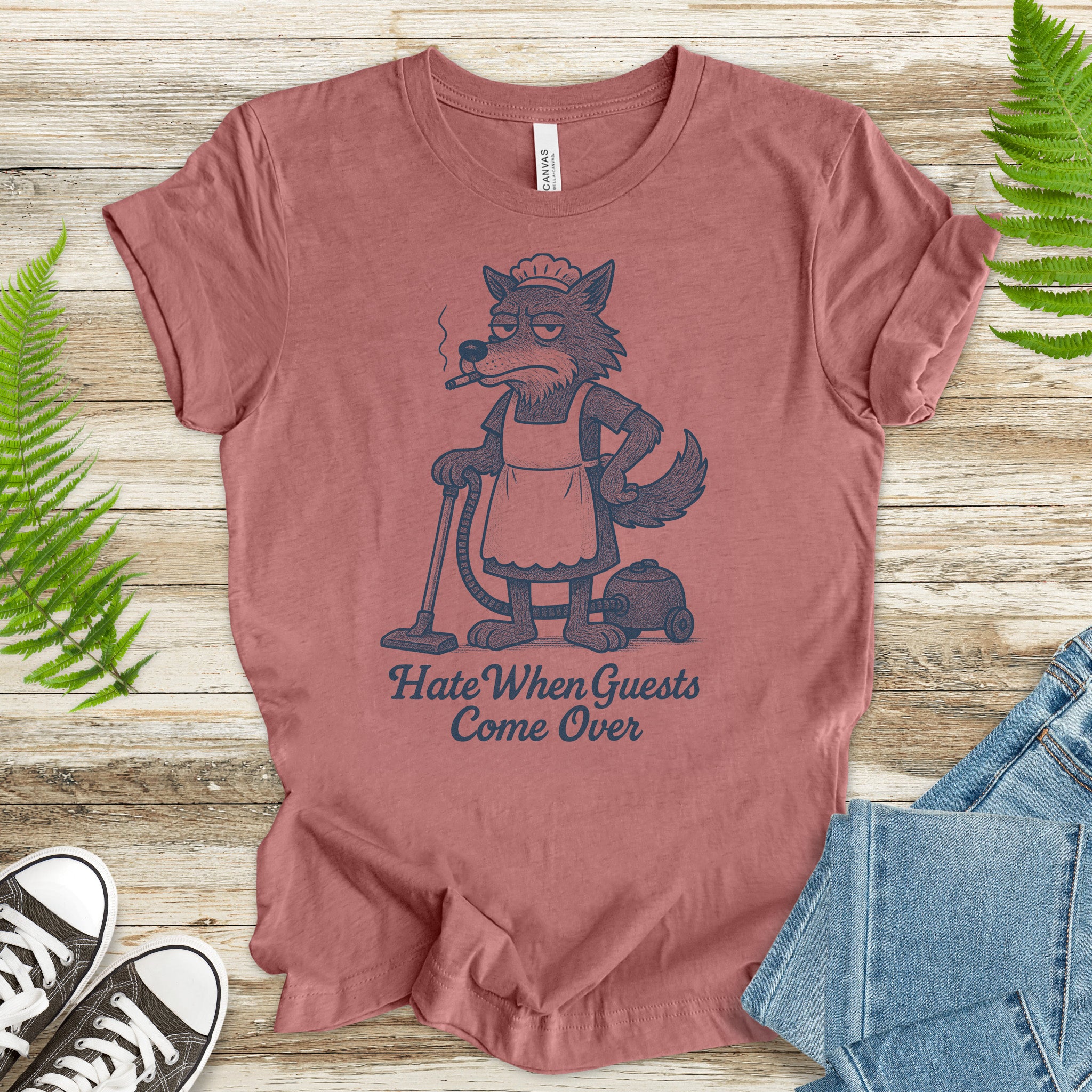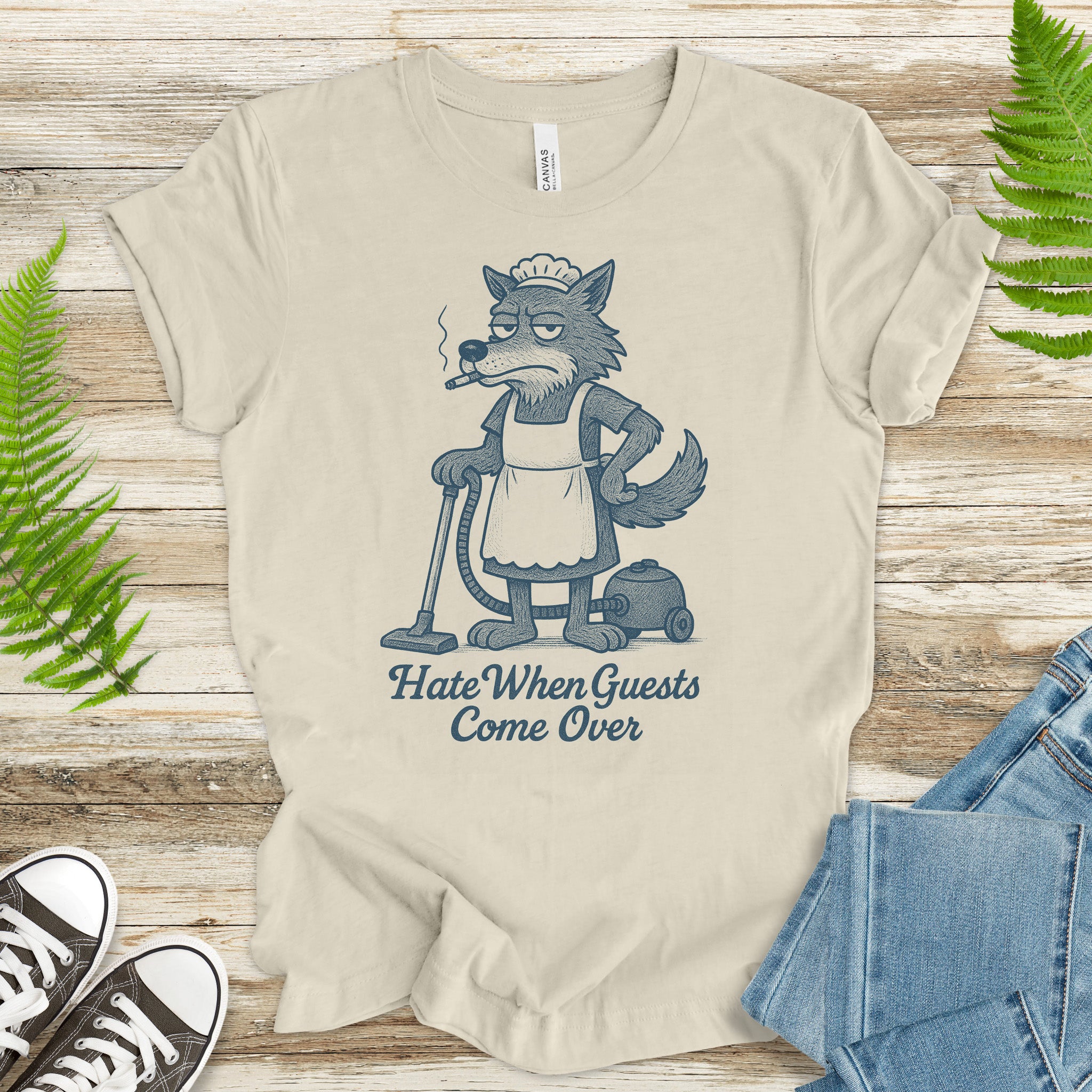 Funny Wolf Maid T-Shirt – “Hate When Guests Come Over” Retro Cleaning Humor Tee
