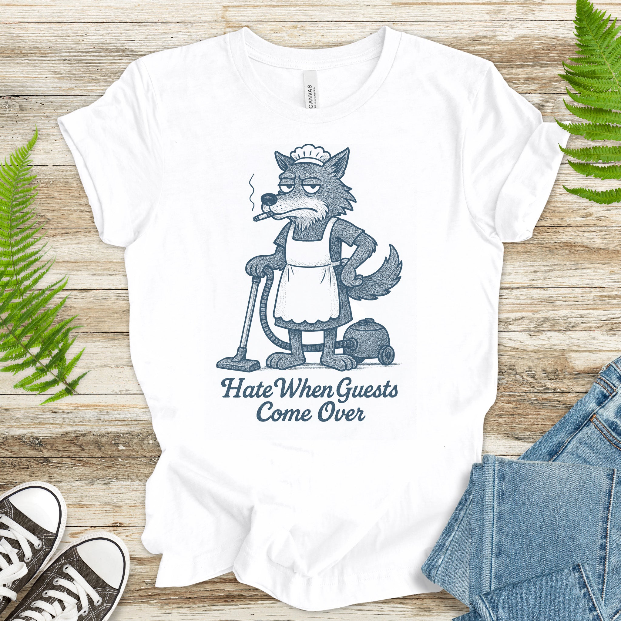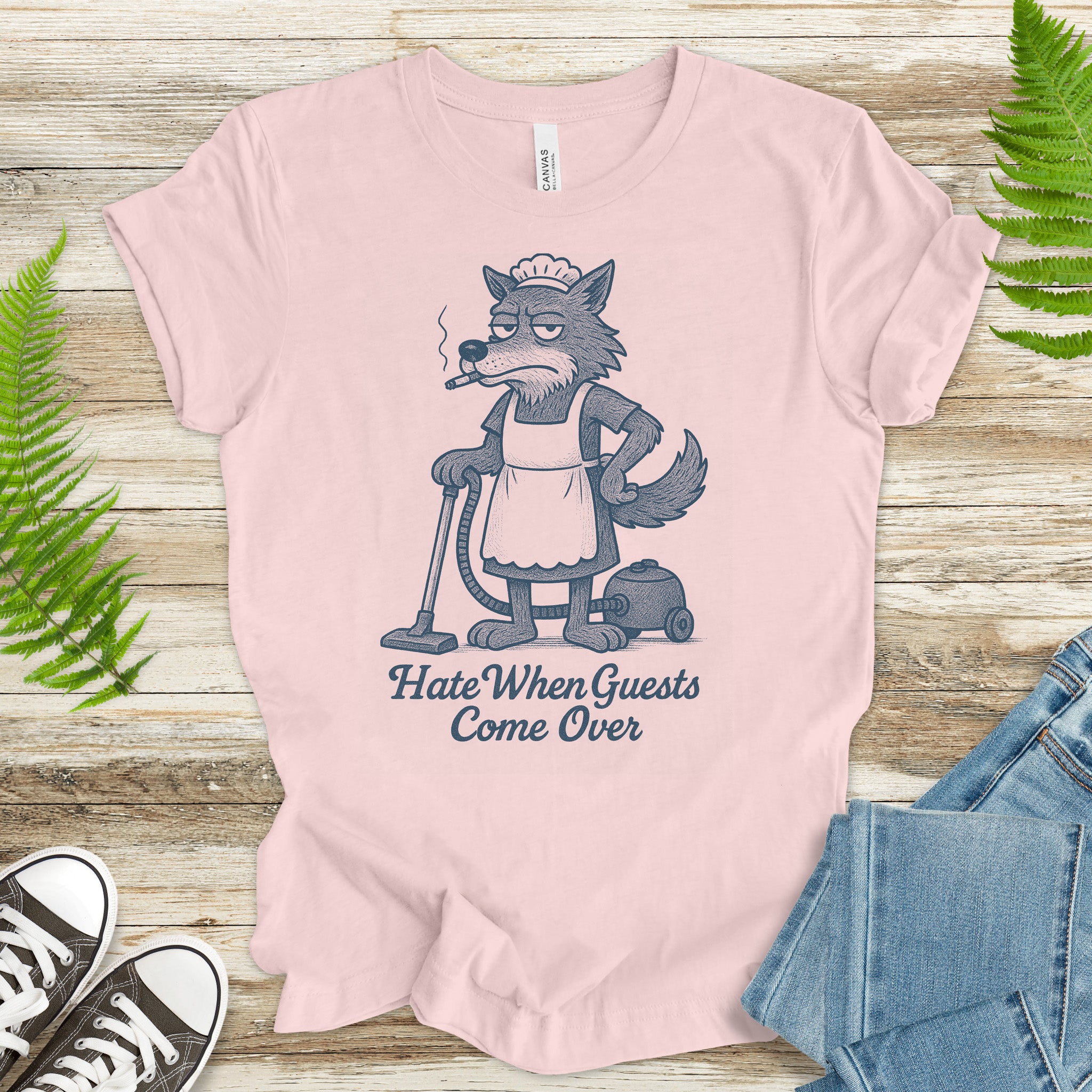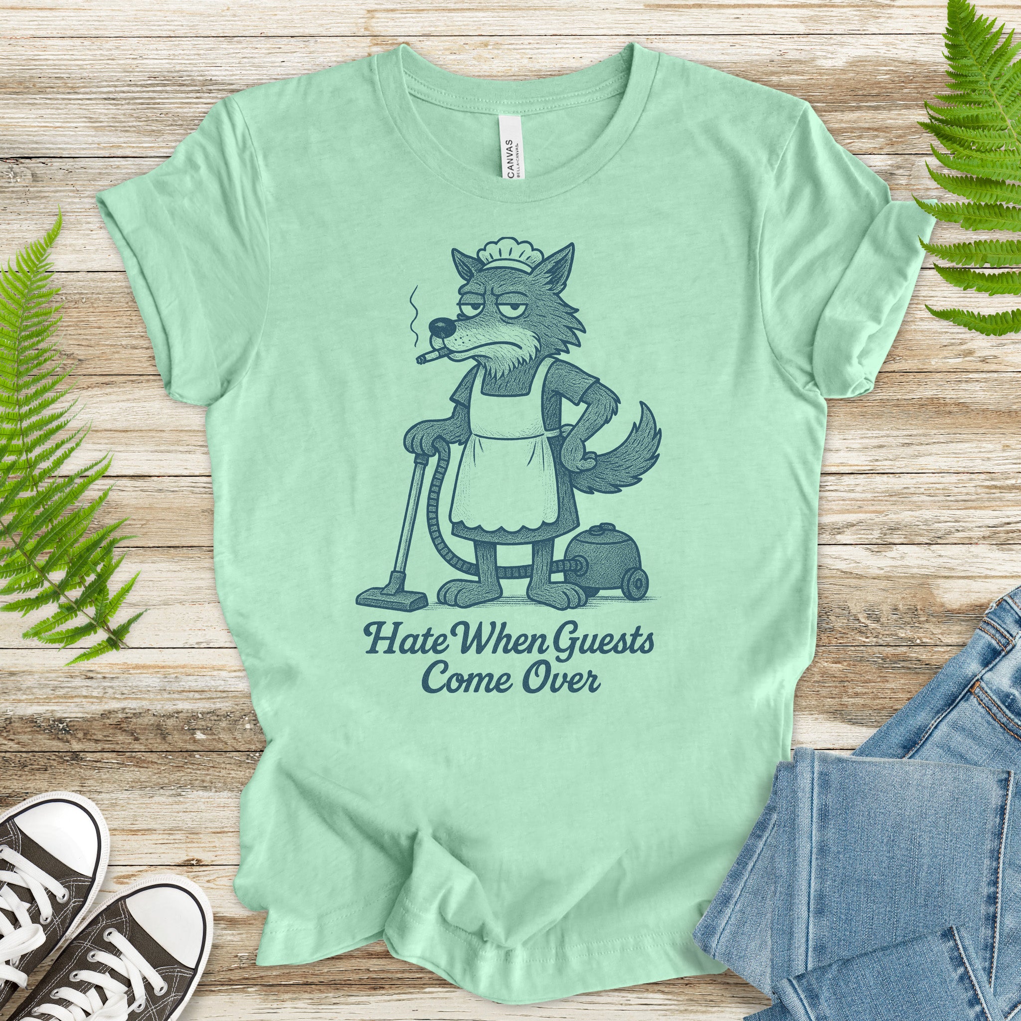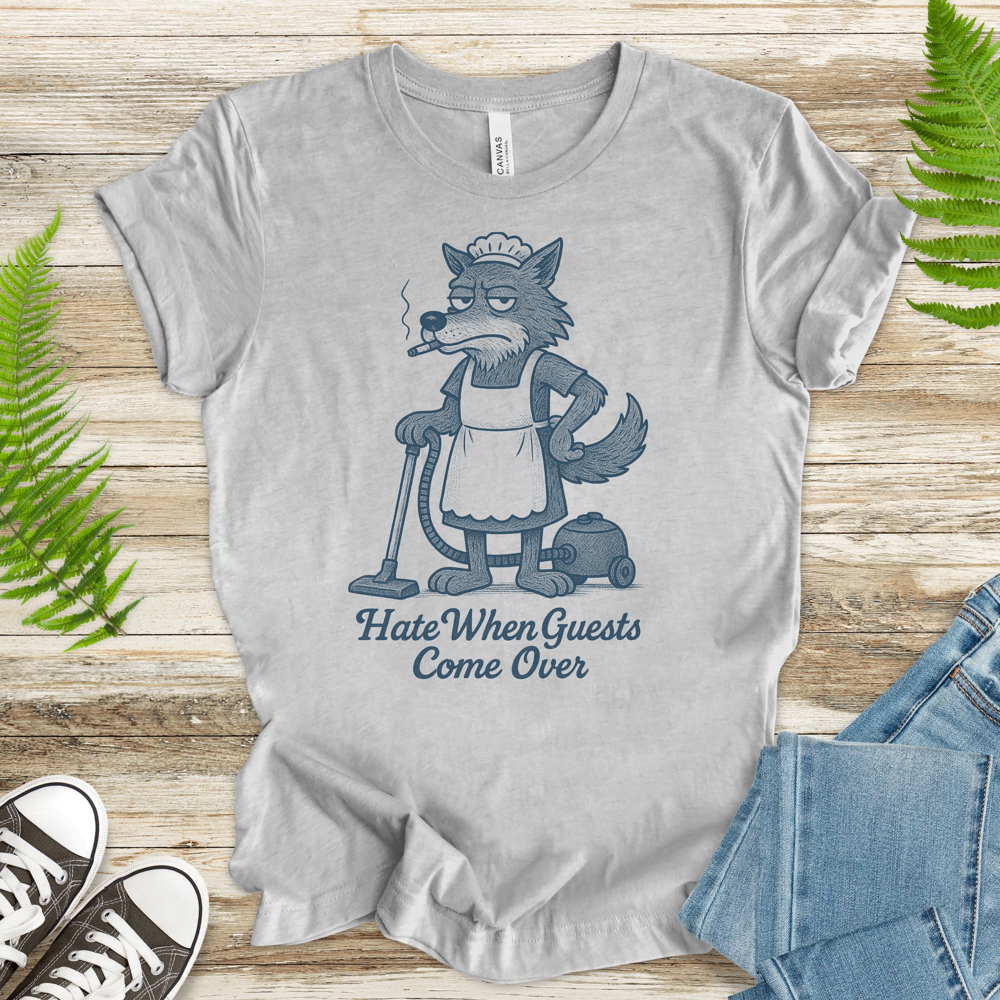 Funny Wolf Maid T-Shirt – “Hate When Guests Come Over” Retro Cleaning Humor Tee