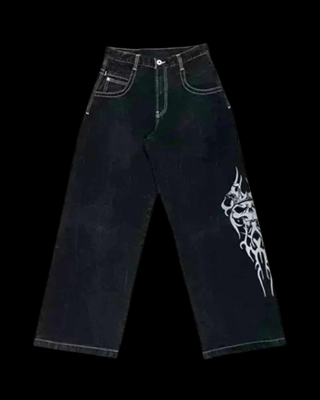Washed black denim with a relaxed straight leg and contrast stitching. White flame-skull graphic runs down the right leg, five-pocket build, and zip fly with button closure. Mid rise; Size up for a looser fit. Blend, true to size, and ready to ship.